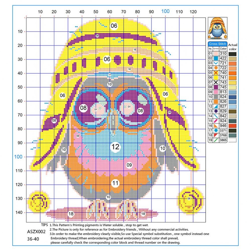 The color block in the drawing does not represent the color of the embroidery thread. Please carefully identify the symbol or the serial number corresponding to the color block, and select the thread number according to the serial number requirements.